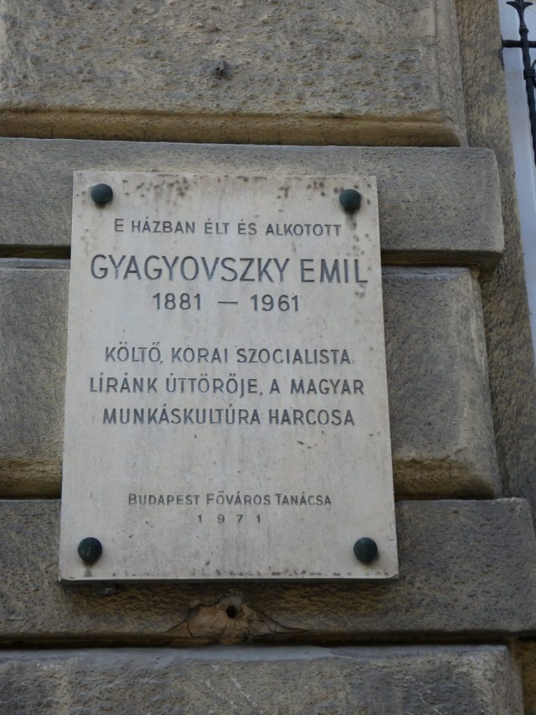 Nem tudom 1971-es felhelyezése óta volt-e bármikor koszorúzás vagy megemlékezés a Barcsay utca 8. előtt, ahol Gyagyovszky Emil emléktáblája áll, de gyanítom, hogy soha. Arra is mérget veszek, hogy a budapestiek 90 százalékának fogalma sincs arról kicsoda e furcsa vezetéknevű ember, aki barátainak csak Gyagya volt. Márpedig, ha már emléktáblája áll Erzsébetvárosban, hiszen évtizedeken át lakott a Barcsay utcában, akkor ne feledkezzünk meg a szocializmus Szabolcska Mihályáról, a lánglelkű fűzfapoétáról, a magyar munkáskultúra élharcosáról, a remekbe rakott rímek káderesen képzett kezelőjéről.